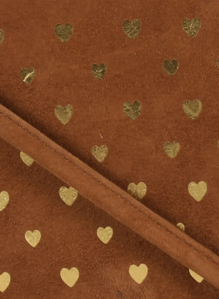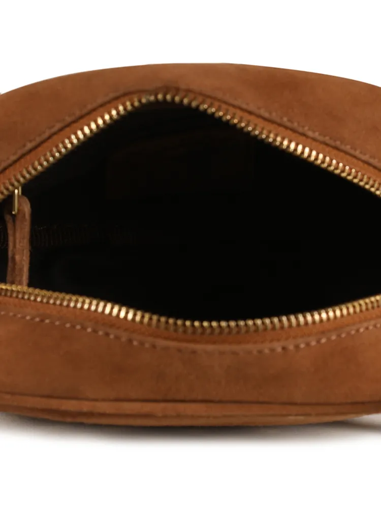 Tan leather shoulder strap is long enough to be worn cross-body,